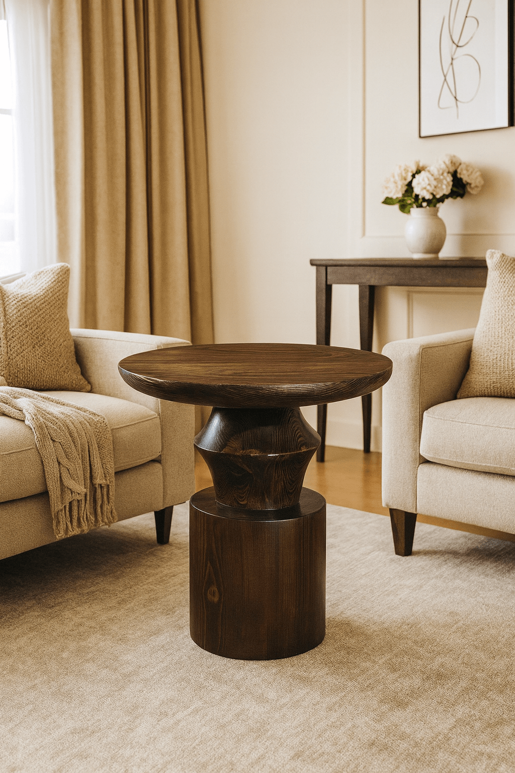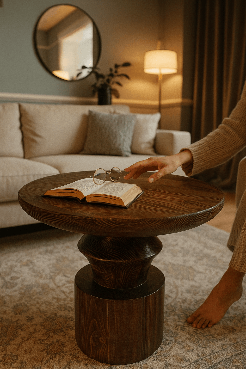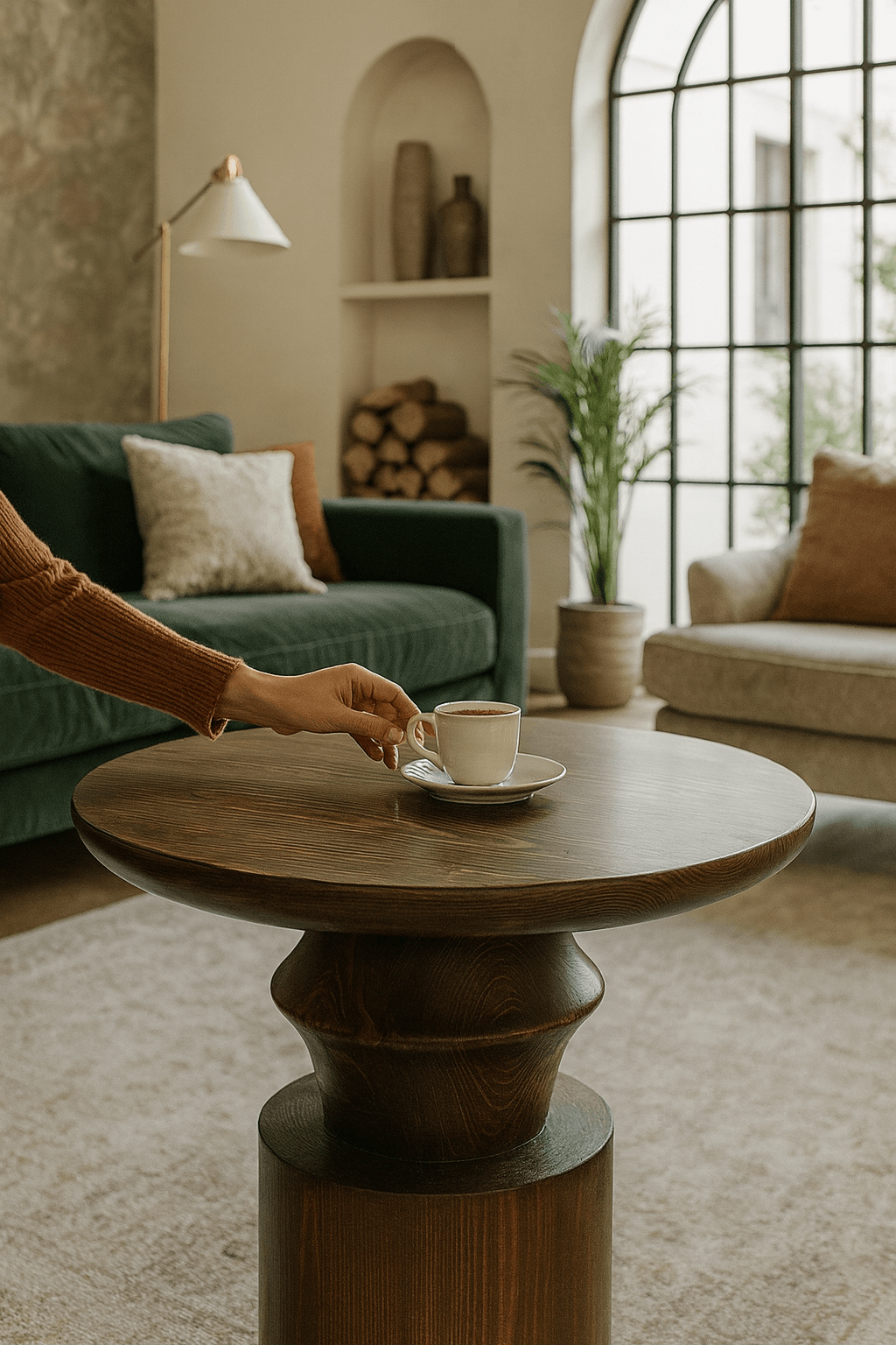 El işçiliğiyle üretilen bu zarif orta sehpa, 45 cm yüksekliği ve 55 cm tabak çapı sayesinde hem dekoratif hem fonksiyonel bir parça olarak öne çıkar. Doğal ahşap malzemesiyle rustik bir hava yaratırken, dayanıklı yüzeyi uzun ömürlü kullanım sağlar.